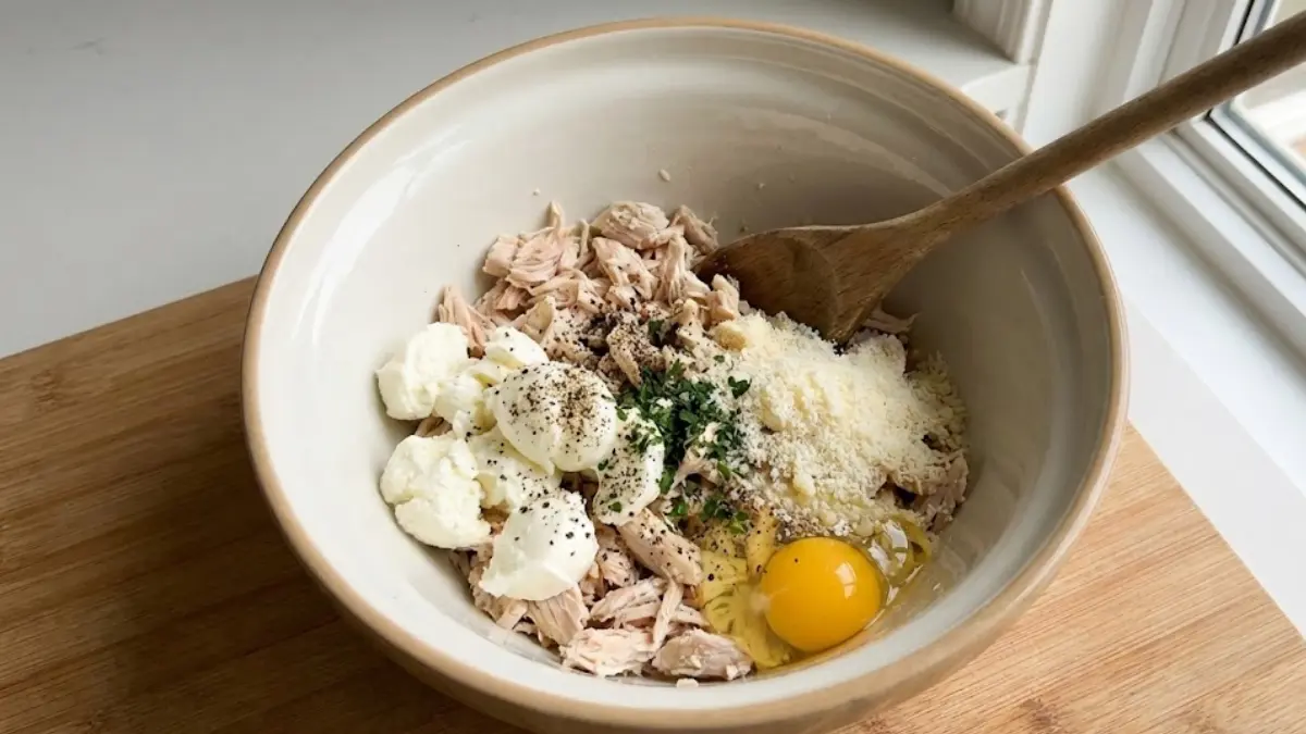 In a bowl, combine chicken, mozzarella, parmesan, egg, and seasonings. Mix until it forms a thick dough-like mixture.
