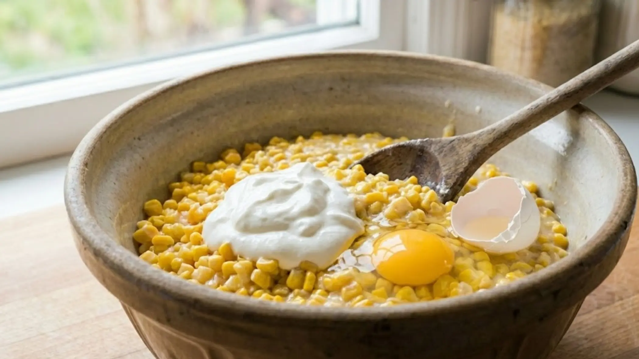 - Prepare the Corn Mixture In a large mixing bowl, combine the drained whole kernel corn and creamed corn. Stir gently to evenly mix the textures without breaking the kernels.