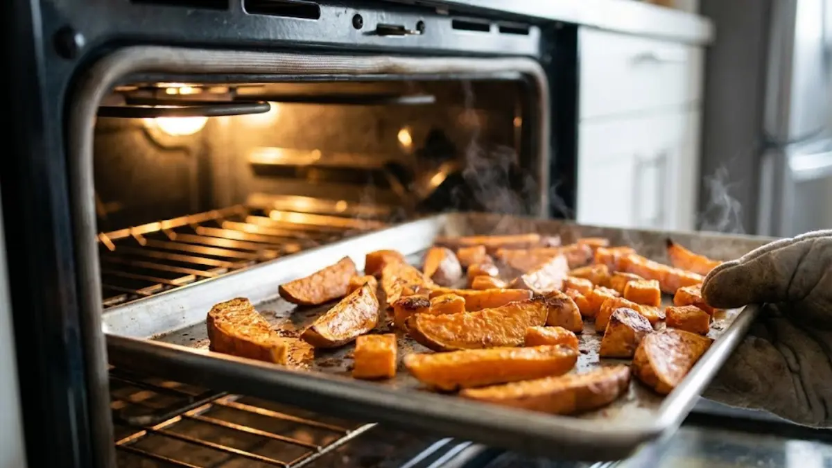 Preheat oven to 200°C / 400°FSpread sweet potatoes on a baking tray in a single layerRoast for 25–30 minutes, flipping halfwayOption 2: Pan-Cooked (Quick Method)